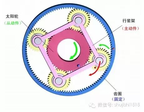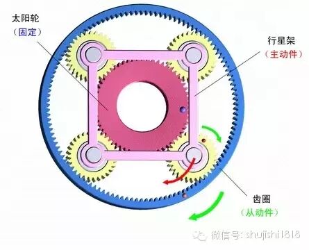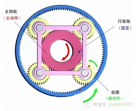 5)行星架固定,太阳轮主动,齿圈被动。